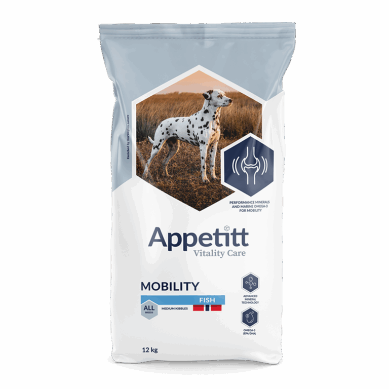 - Appetitt Vitality Care Mobility has a high content of the essential omega-3 fatty acids EPA and DHA, which are important for joints and mobility.